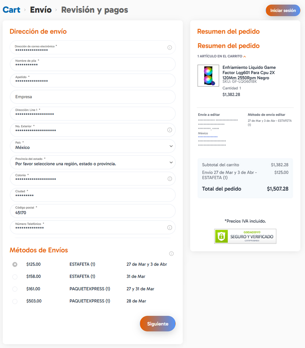 En esta pantalla podrás ver el resumen de tu compra, pero antes llena la información y elige tu método de envio para estimar el costo total.
