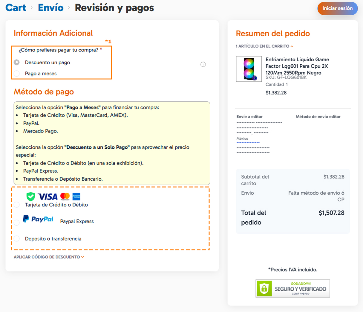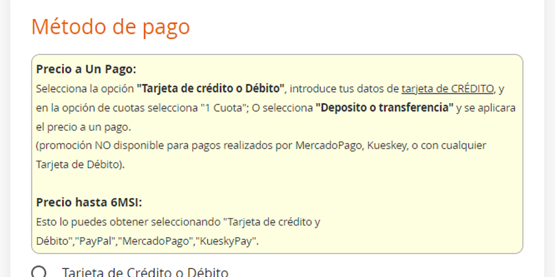Los códigos de descuento de Mercado Pago y KueskiPay se introducen una vez que eres redireccionado a su sitio, no en el apartado de nuestra página.