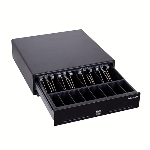 Cajón de dinero TechZone con 4 billetes y 8 monedas, color negro.