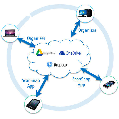 Al tener ScanSnap Sync integrado en el software ScanSnap Organizer y la aplicación ScanSnap Connect, los documentos capturados se sincronizan automáticamente con todos sus dispositivos mediante Dropbox, Google Drive o Microsoft OneDrive.