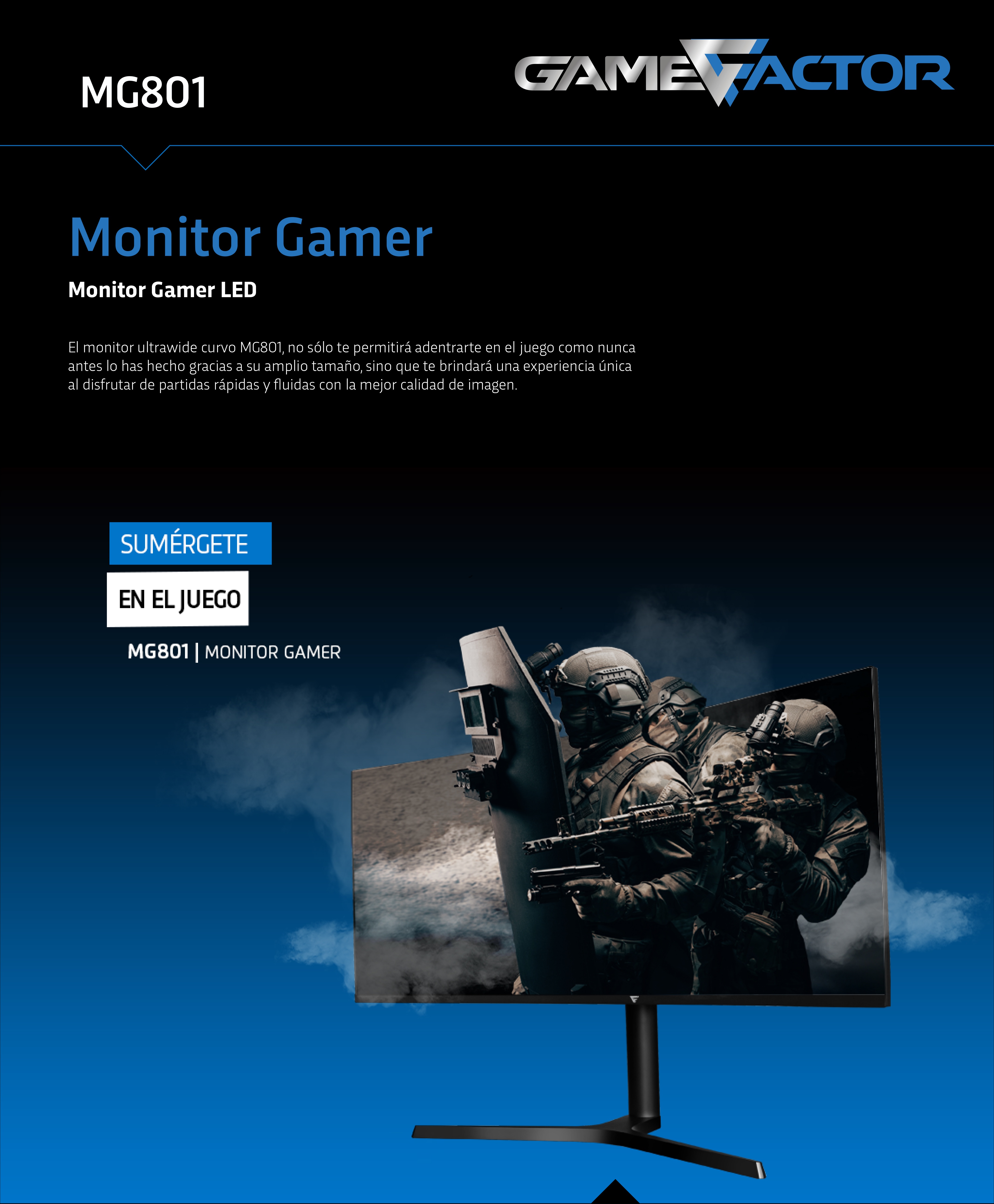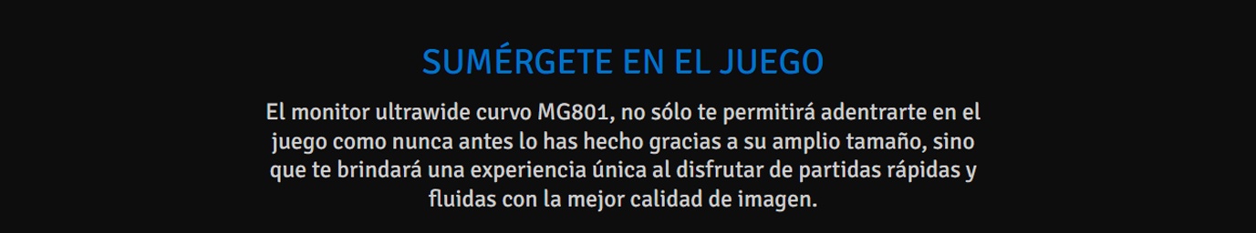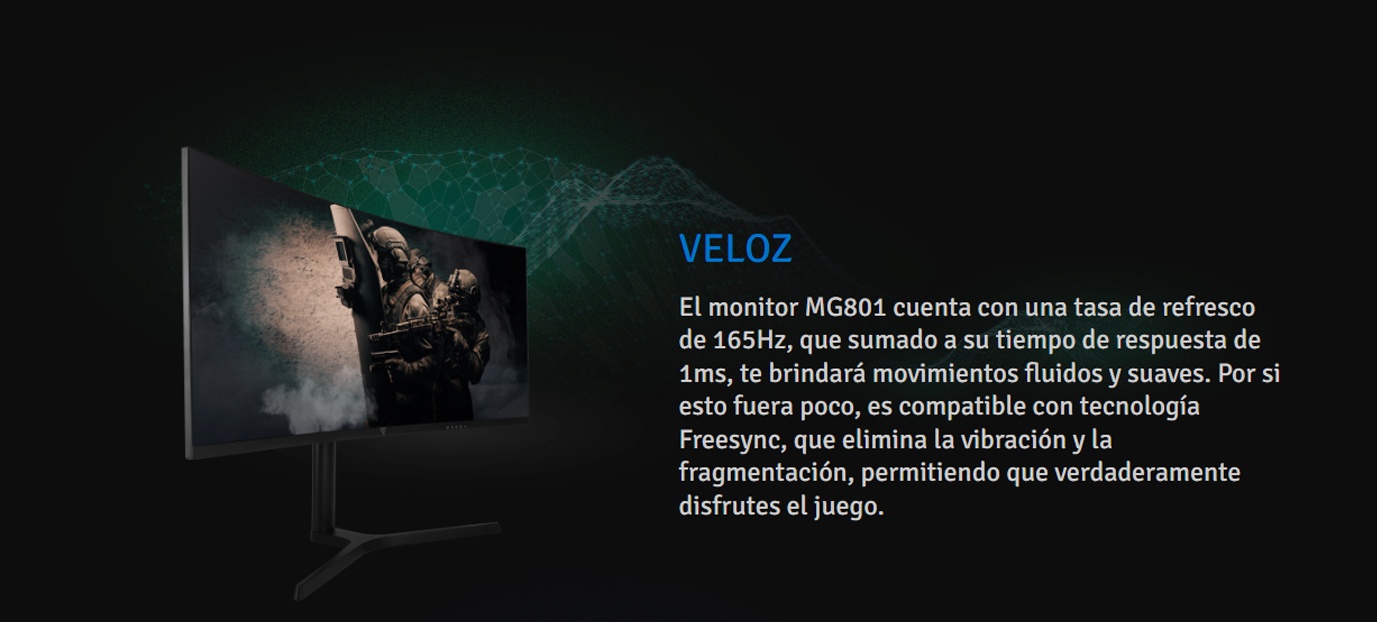 El monitor ultrawide curvo MG801, no sólo te permitirá adentrarte en el juego como nunca antes lo has hecho gracias a su amplio tamaño, sino que te brindará una experiencia única al disfrutar de partidas rápidas y fluidas con la mejor calidad de imagen.