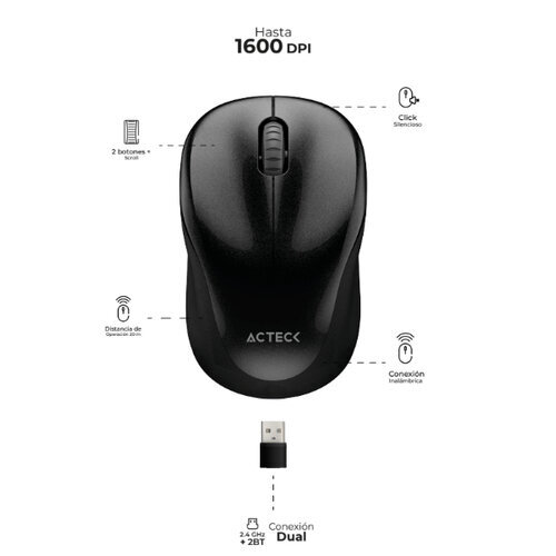 Acteck OPTIMIZE TRIP MI 480, Ambidiestro, Óptico, RF inalámbrico, 1600 DPI, Negro