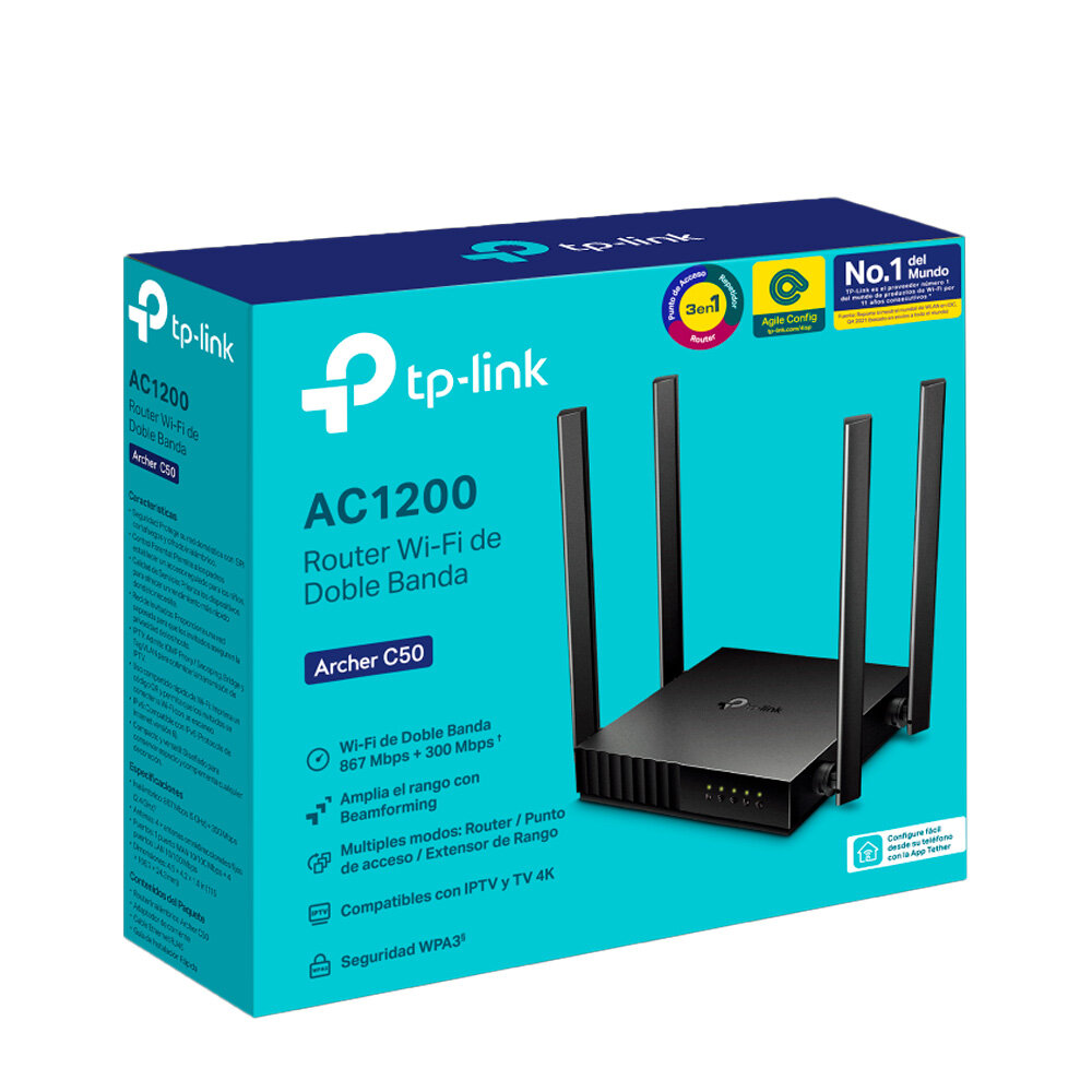TP-Link Archer C50, Wi-Fi 5 (802.11ac), Doble banda (2,4 GHz / 5 GHz), Ethernet, Negro, Router de mesa